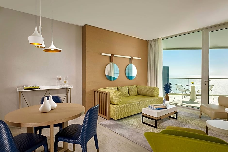 This is airy, open-concept room with a king-size bed and lounge area with elegant, furniture and lighting. Guests will enjoy mirrored walk-in closet and balcony with sea-view. The bathroom includes bathtub and power shower, with mosaic detailing and a glass screen.